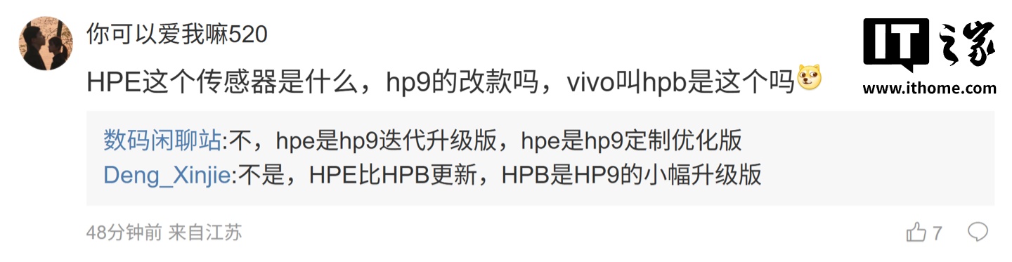 后续有用户在评论区询问:“HPE 这个传感器是什么,hp9 的改款吗,vivo 叫 hpb 是这个吗 [狗头斜眼]”,博主回复道:“不,hpe 是 hp9 迭代升级版,hpe 是 hp9 定制优化版”;另一名用户则询问道:“啥时候能全部用上一英寸的大底传感器”,博主则回复道:“一英寸超大杯都很罕见了”。