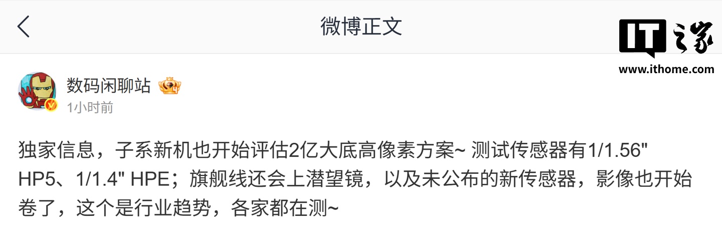 博主表示,这台手机目前在测试 1/1.56 英寸 HP5、1/1.4 英寸 HPE 等 CMOS 传感器,旗舰产品线还会上潜望镜,以及未公布的新传感器,影像“也开始卷了”,同时各家也在测试类似的传感器,是行业趋势。