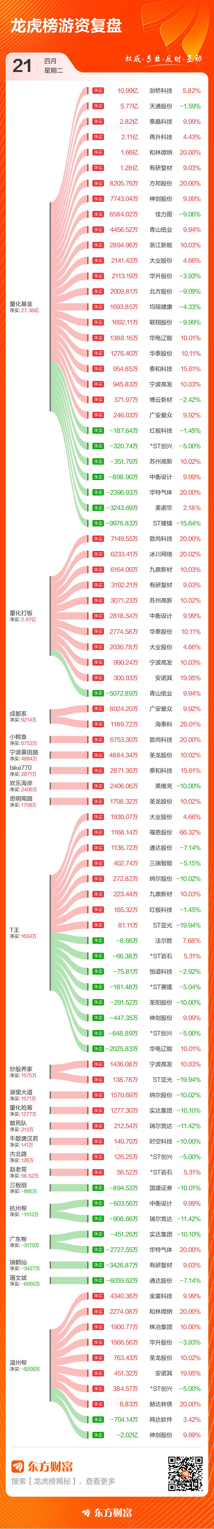 4月21日共有71只个股(含1只可转债)上榜龙虎榜,总上榜成交额197.01亿元。上榜个股中净买入额最高的是云南锗业,三天累计净买入金额为9.33亿元。