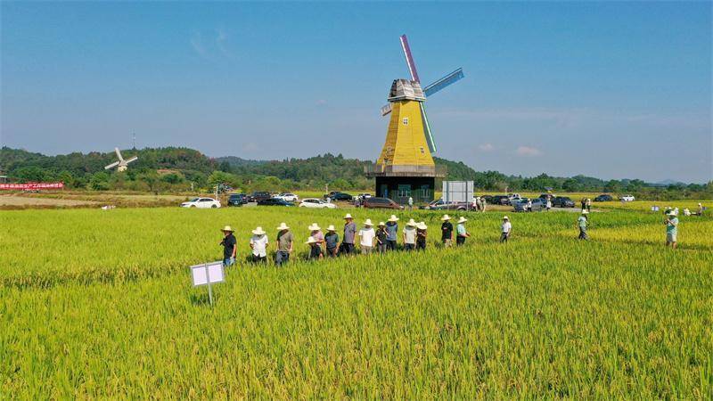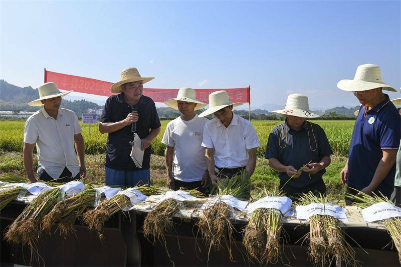 农业专家和参会人员对晚稻品种进行筛选评比。邓鹏摄